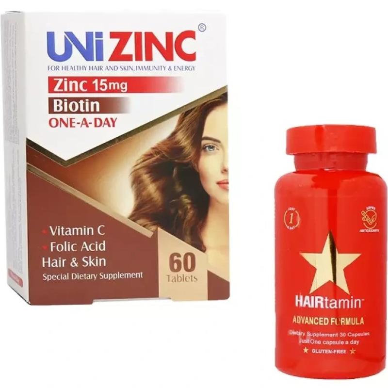 پک کپسول هیرتامین 30 عددی به همراه قرص یونی زینک 60 عددی hairtamin tablet+uni zinc